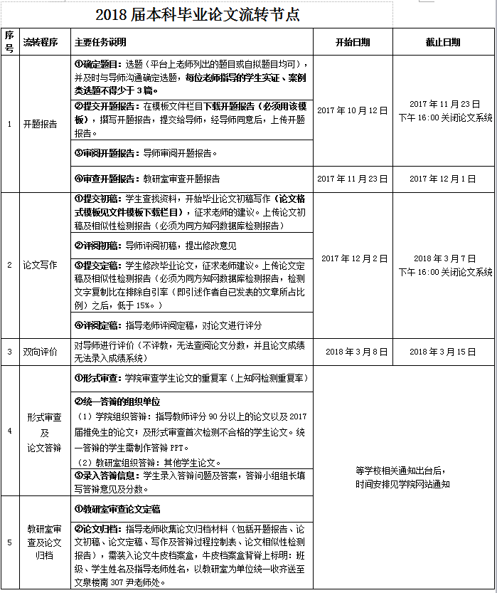 学院已在论文系统中设置各阶段的时间节点(如下表),请指导教师和学生严格遵照相关的时间要求进行,到期关闭论文系统。大家完成论文之后可以提前进行知网查重检测。